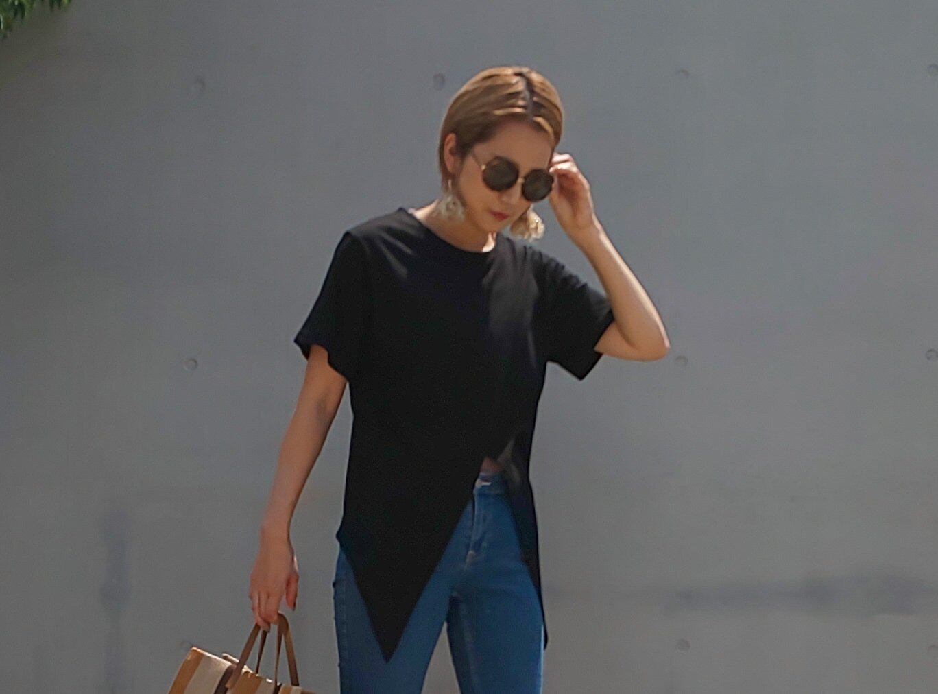 モードな雰囲気に仕立てたアシンメトリーシルエットのデザインTシャツ。